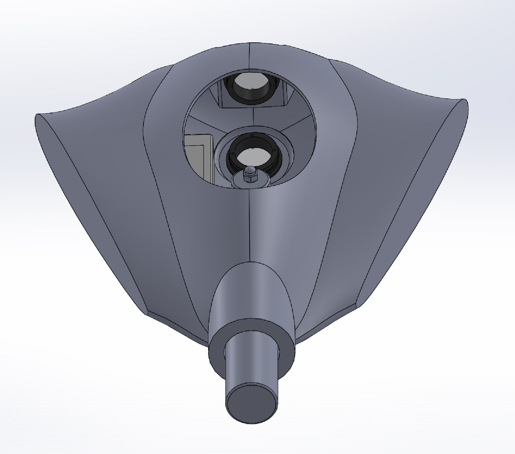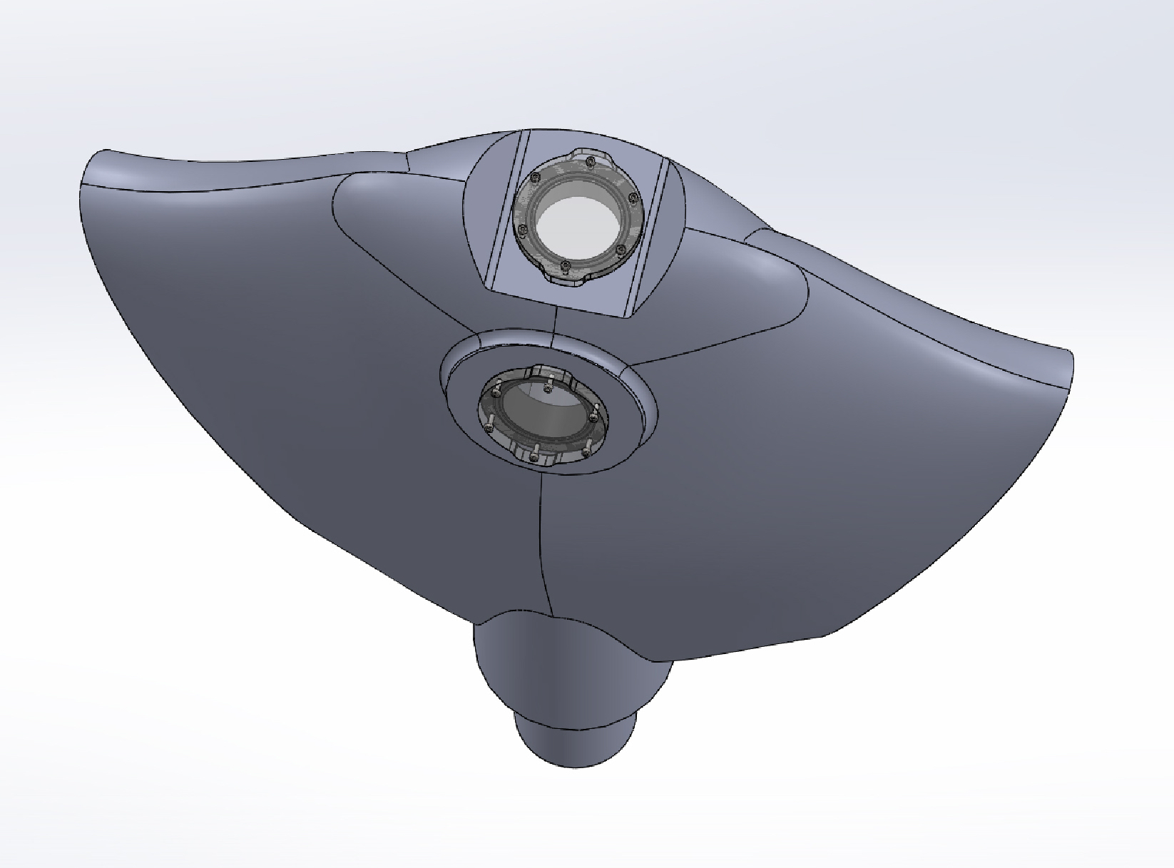 While the shark inspired design is looking like it will be the form factor for our main research platform, another hull design – one based around a manta ray – was created to experiment with embedding components into cast hulls. Here you can see the initial design. The wings of the ray will bolt onto the frame, and they are missing in these renderings.
