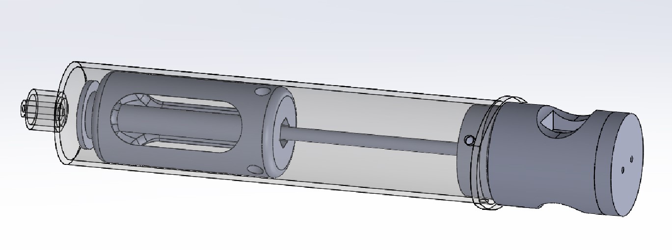 Our design uses a single captured nut to drive the piston. The piston is printed, and its base contains a recess fitted to a M3 bolt. After the bolt is seated in the recess a cap is glued to the end of the piston capturing it. The final design with the new piston can be seen in the mockup below. (The nut capturing cap is not visible so that the nut recess is).