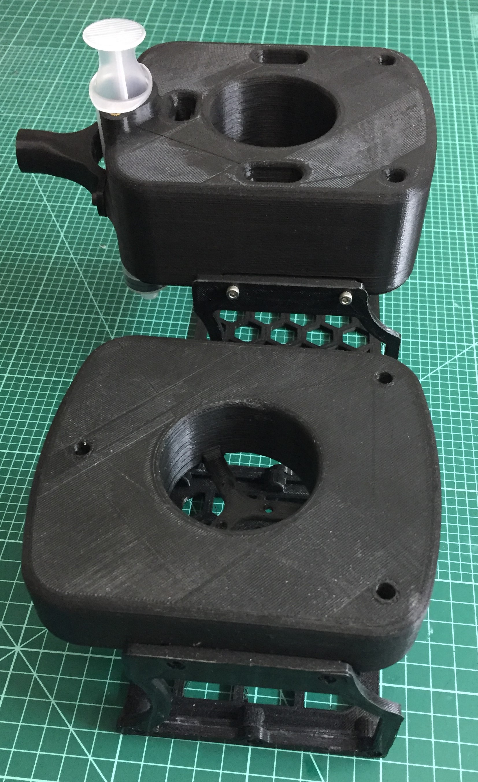 In the second mockup of the tiny ROV the design grew significantly in size. The major driver of change between V1 and V2 has been adding a bunch of electronics that live inside the electronics chamber. (Electronics chamber is still being designed and is not shown here).